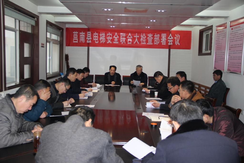 1月17日,莒南县市场监管局召开全县电梯安全联合大检查部署会议。县局副局长王剑泉主持会议并讲话,县局市场监管执法大队长宋代祥,城区所、十字路镇所、特种设备管理科负责人以及执法大队1、2、3中队全体人员参加会议。