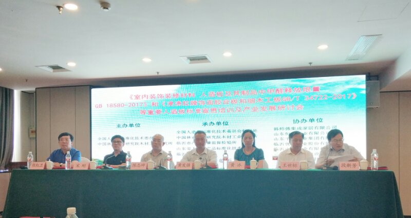 2018年6月20日,GB 18580—2017《室内装饰装修材料 人造板及其制品中甲醛释放限量》和GB/T 34722—2017《浸渍胶膜纸饰面胶合板和细木工板》等人造板标准宣贯培训及研讨会在山东省临沂市成功举办。会议由全国人造板标准化技术委员会、中国林科院木材工业研究所主办,全国人造板标准化技术委员会秘书处、中国林科院木材工业研究所、临沂市产品质量监督检验所、山东省人造板产品标准化技术委员会和临沂市木业协会承办,韩师傅集成家居有限公司、山东恒瑞木业有限公司、山东千森木业集团有限公司、临沂优优木业股份有限公司、临沂山大木业有限公司、东莞市升微机电设备科技有限公司、上海福轩环保科技有限公司协办,来自全国人造板相关企业、质检机构和科研院所等单位,尤其山东省人造板企业家150余位代表参加会议。